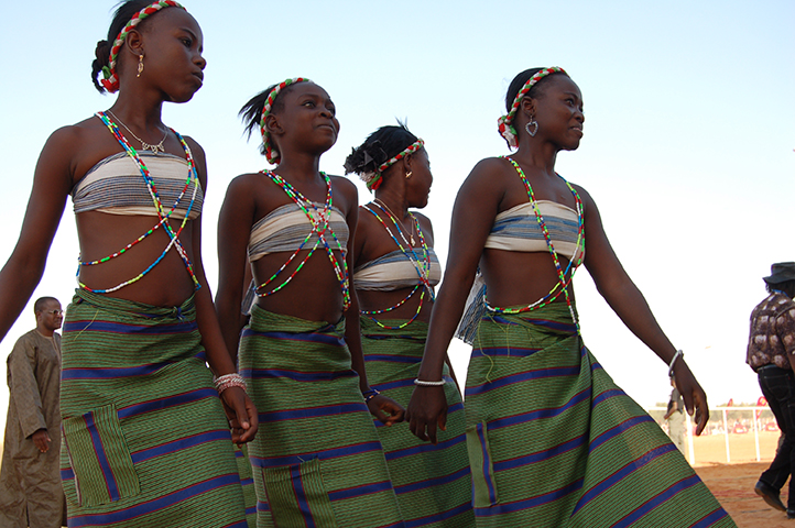 Batteurs et danseurs en tenue traditionnelle gourmantché, sur une scène